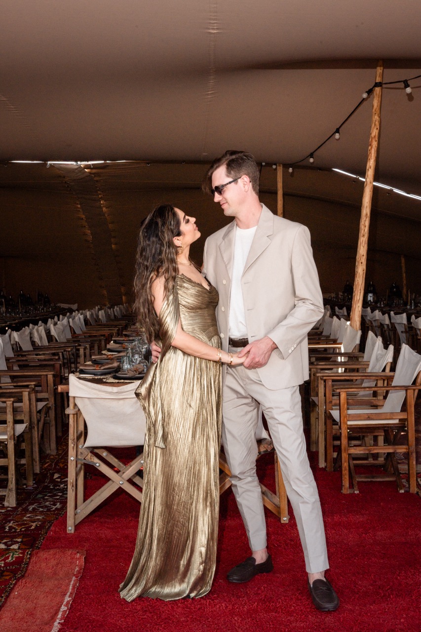 The festivities began with a pre-wedding celebration in the Agafay desert, just outside the city. Surrounded by rocky dunes and golden light, Scarabeo Camp provided the perfect setting for this luxury desert wedding in Morocco. A grand tent welcomed 200 guests into a warm, immersive experience inspired by Moroccan tradition.