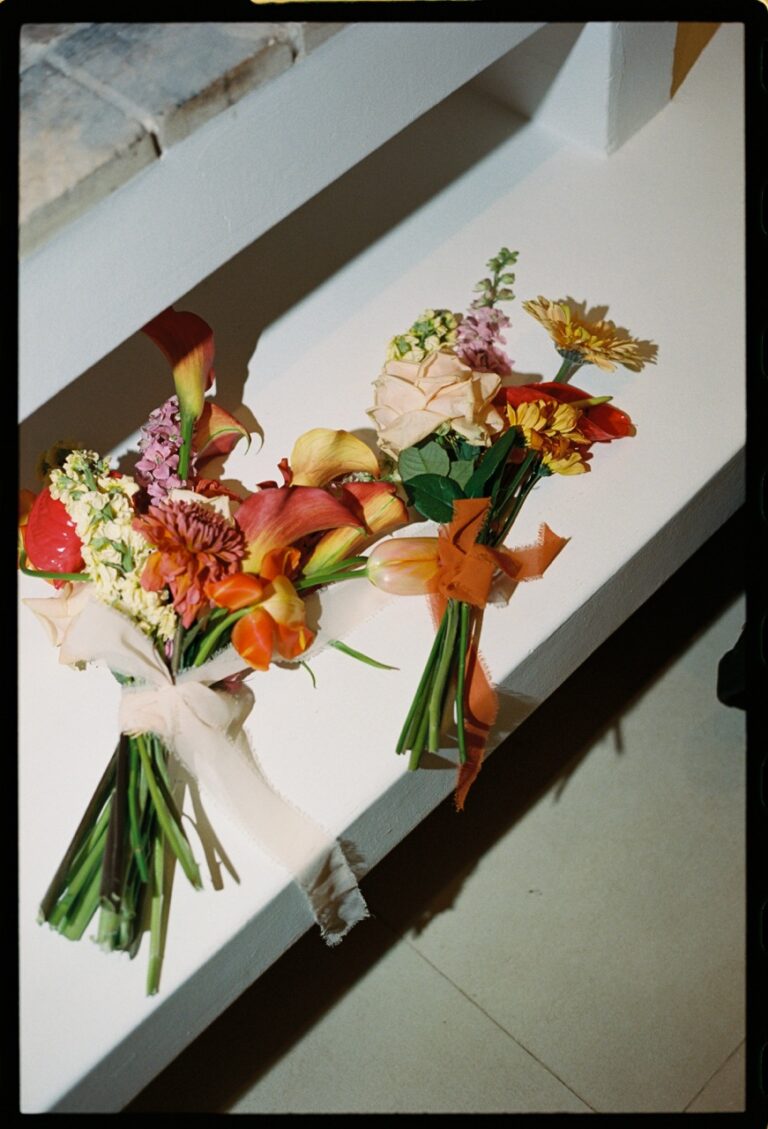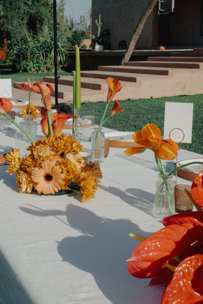 Set in the heart of Dar Sabra’s sculptural courtyard, the ceremony space featured a central white circular platform, beautifully framed with wild, organic floral arrangements. Lush greenery and vibrant blooms in shades of coral, orange, and blush spilled effortlessly around the base, echoing the natural beauty of the Moroccan landscape while adding a joyful pop of color.