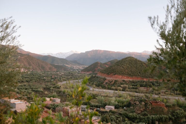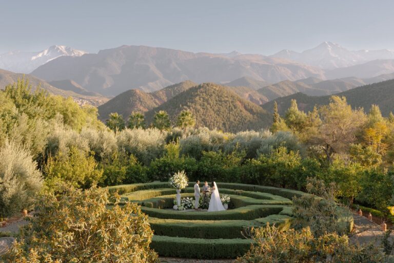 For their ceremony, Alexi and Rick chose the enchanting Kasbah Bab Ourika, perched high above the lush Ourika Valley with sweeping views of the Atlas Mountains. The natural beauty of the setting spoke for itself: wild gardens, panoramic vistas, and the gentle breeze weaving through the olive trees created an atmosphere that was both raw and magical.