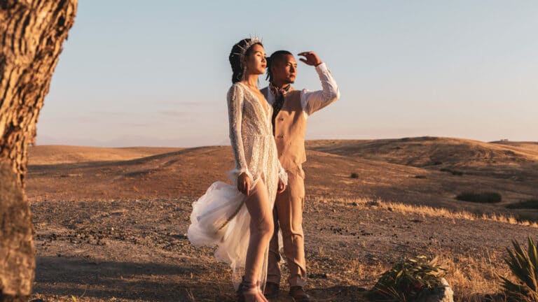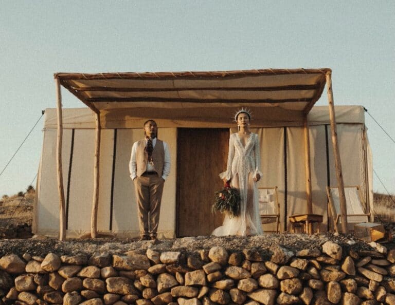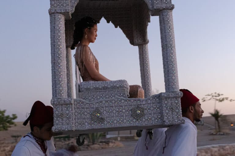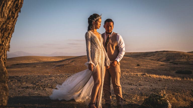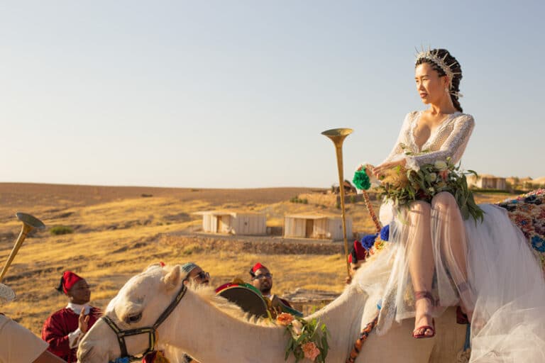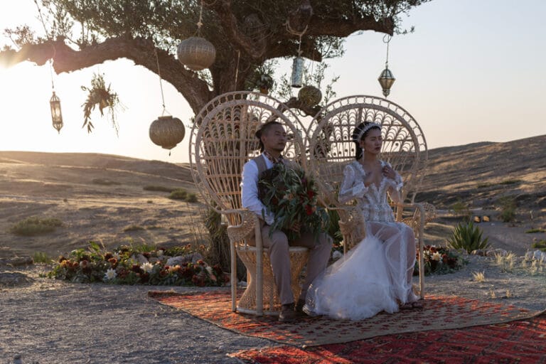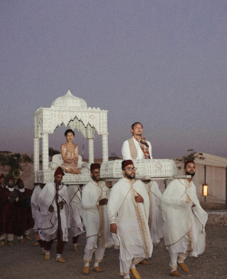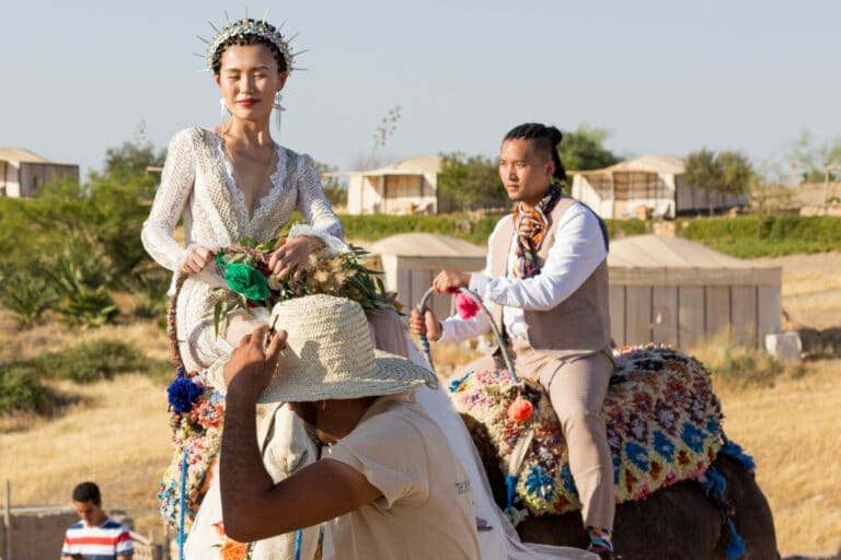 Crowns, camels, color, and one creative couple—just a few of the ingredients that made for this Regal Marrakech Morocco Wedding in the desert. Liz + Nate are a Stateside couple who can’t seem to ever truly satisfy their travel bug—a destination wedding was a no-brainer. While Liz designed + planned the day herself, she did have help on the ground from Party Maroc. Here’s what Liz told us about deciding on Morocco + planning from afar: