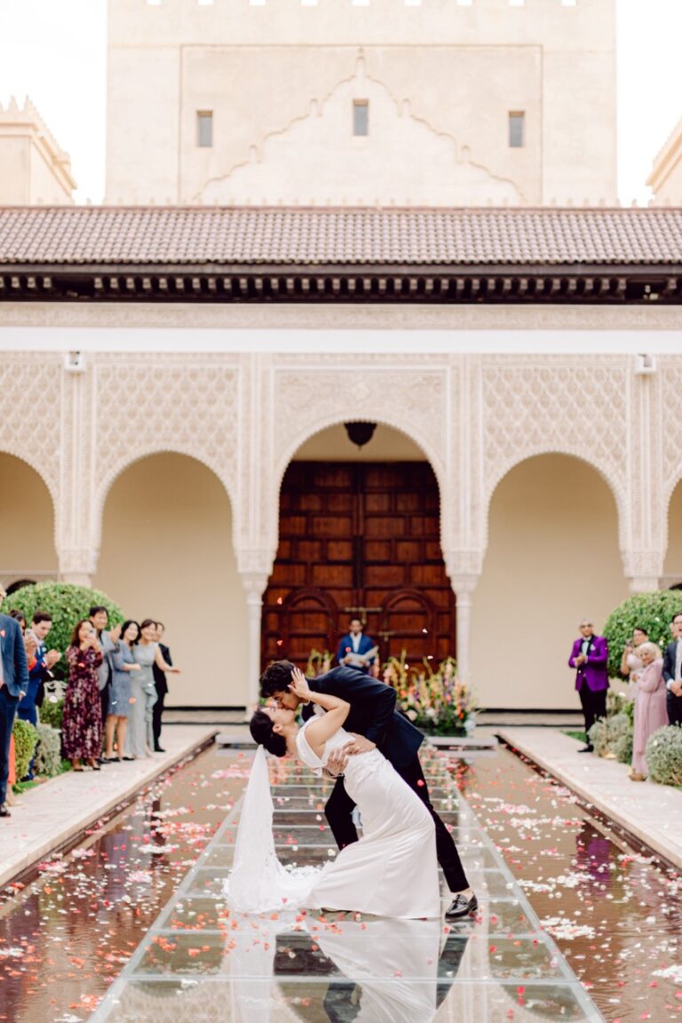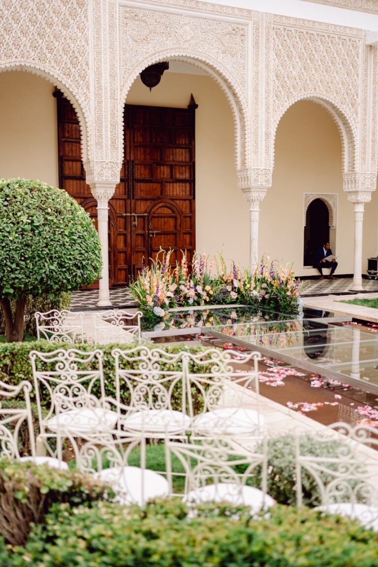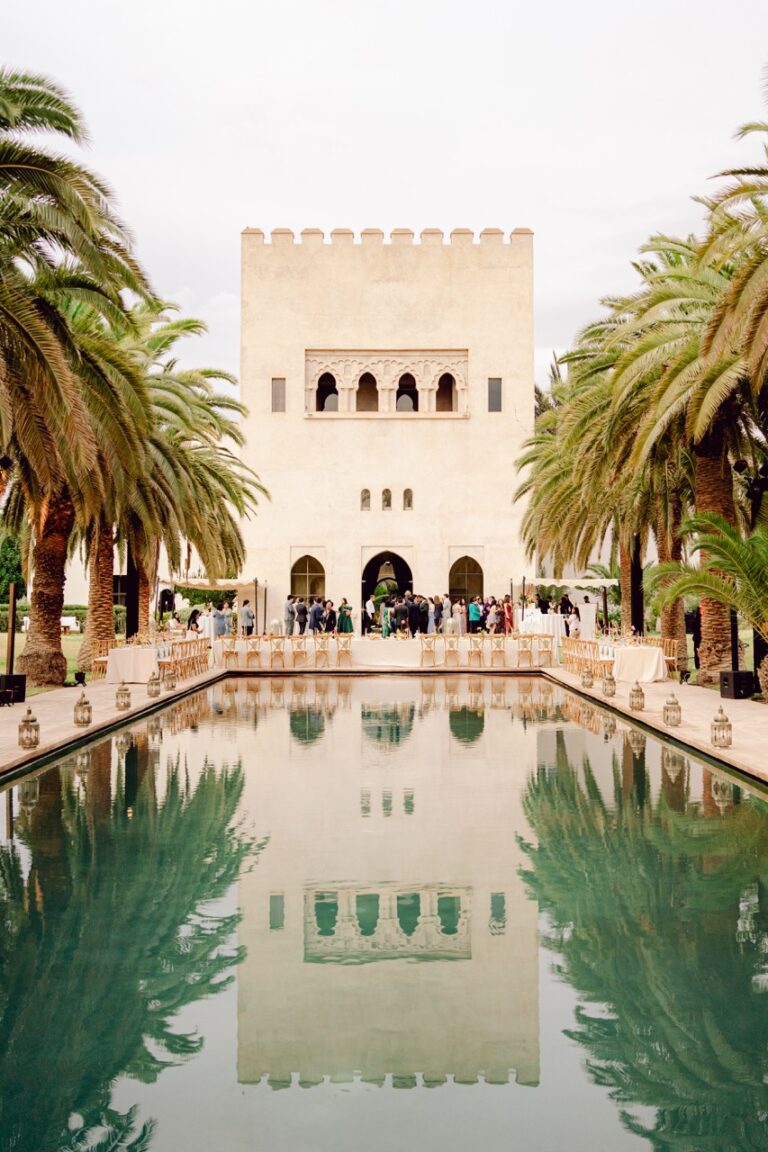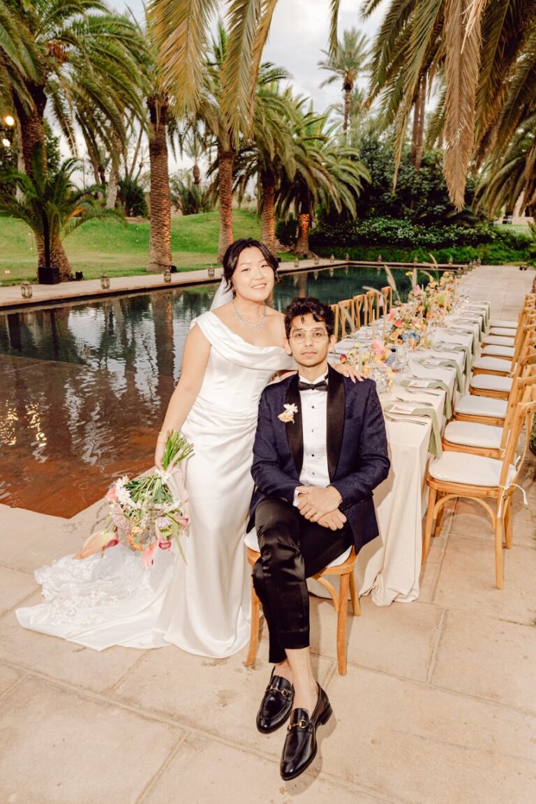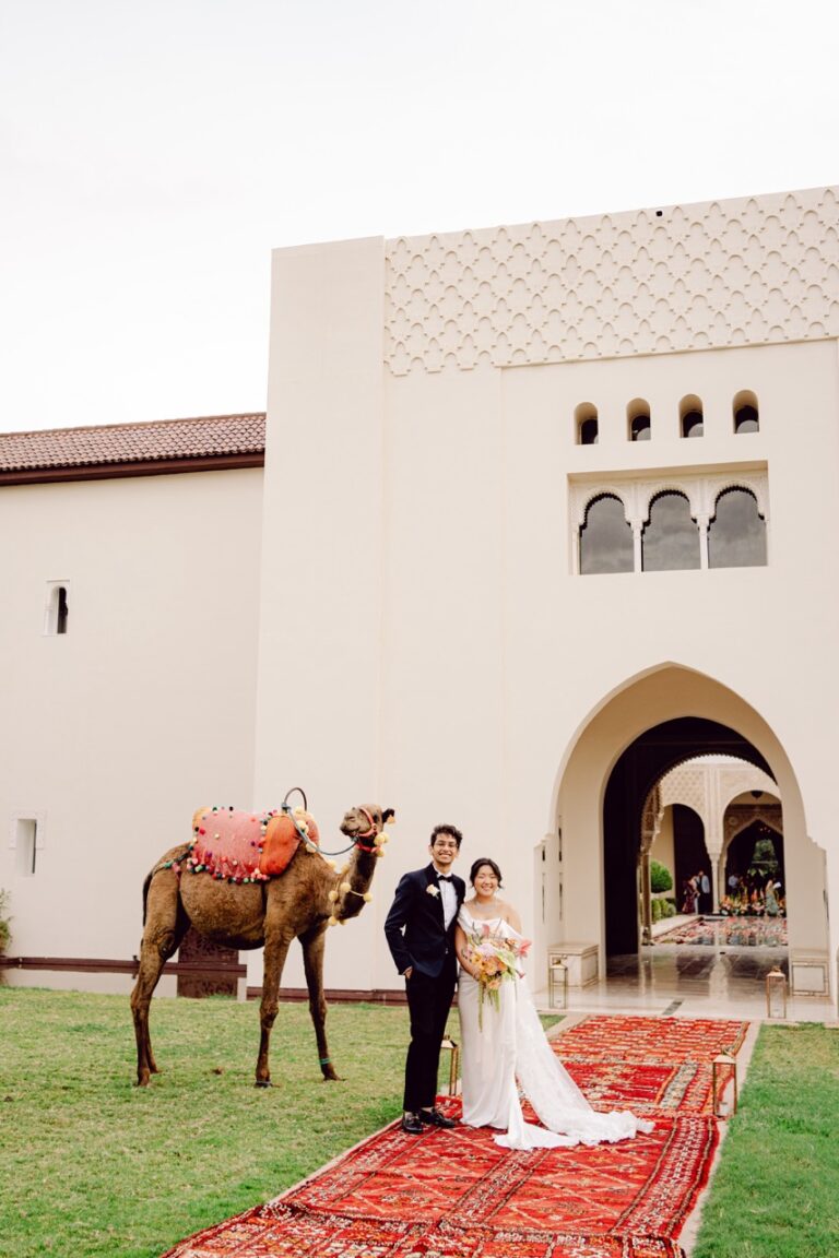 Ksar Char Bagh, a stunning Moroccan palace surrounded by lush gardens and serene courtyards, provided an idyllic venue for this special occasion. Known for its opulent yet intimate atmosphere, the venue perfectly complemented Nilai and Christie’s vision of a sophisticated celebration. The grandeur of the palace, paired with its tranquil ambiance, offered a dreamlike setting for their wedding day.