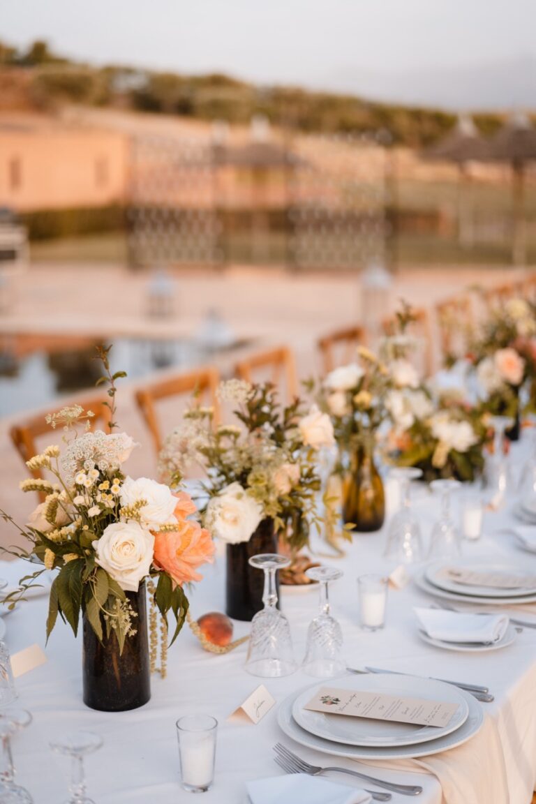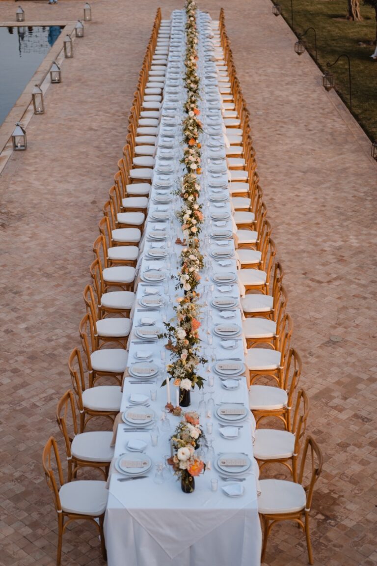 Delicate pastel blooms intertwined with hints of Moroccan design adorned the landscape, paying homage to Farah's heritage and evoking an ambiance of refined luxury. Against this picturesque backdrop, guests indulged in a sumptuous feast, set beside the shimmering pool, and curated with meticulous attention to detail, from bespoke stationery to locally sourced delicacies.
