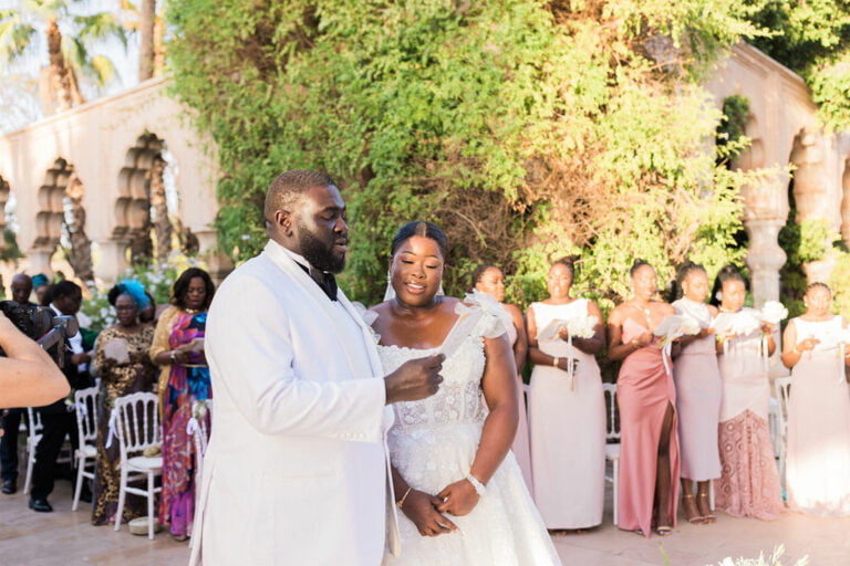 Sope and Kayode had a beautiful and luxurious outdoor wedding ceremony in the grounds of the exclusive Marrakech venue Palais Namaskar. With its elegant Moroccan architecture providing a breathtaking backdrop, this unique destination wedding was magical and memorable. They flew in a priest from London to perform their romantic ceremony in front of 250 of their guests. White floral arrangements in elegant designs adorned the space, giving a chic and stylish aesthetic to their white wedding.