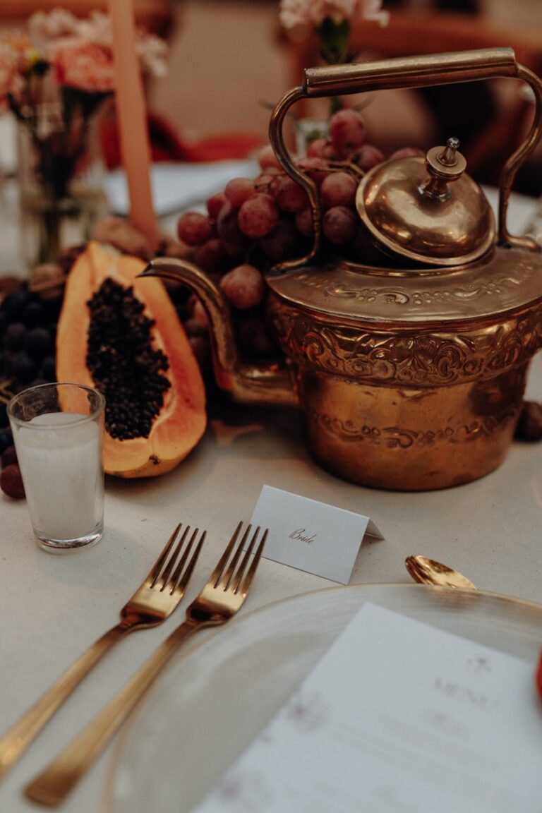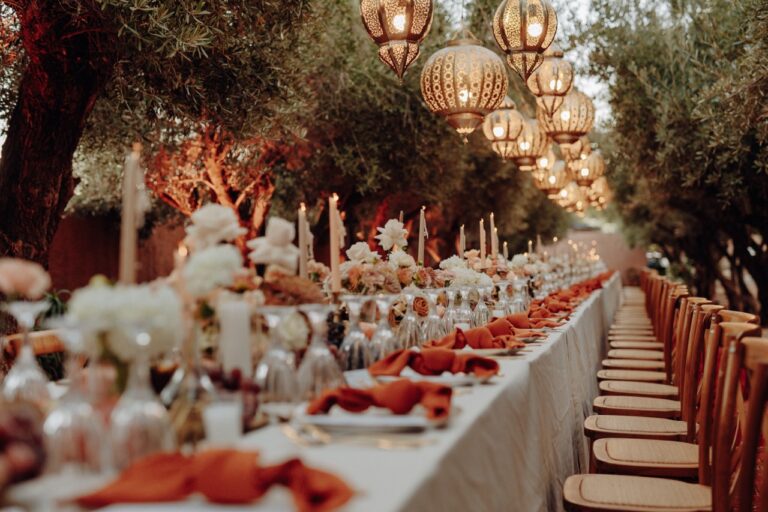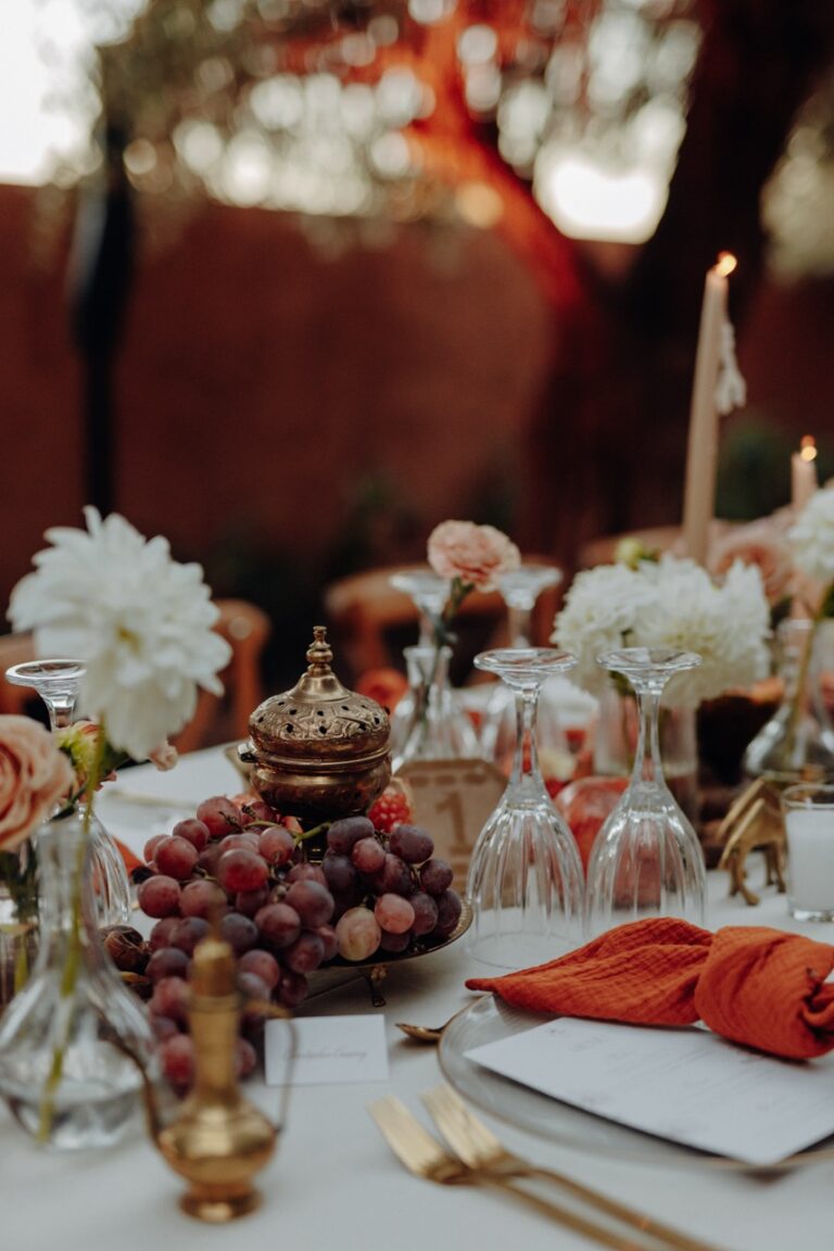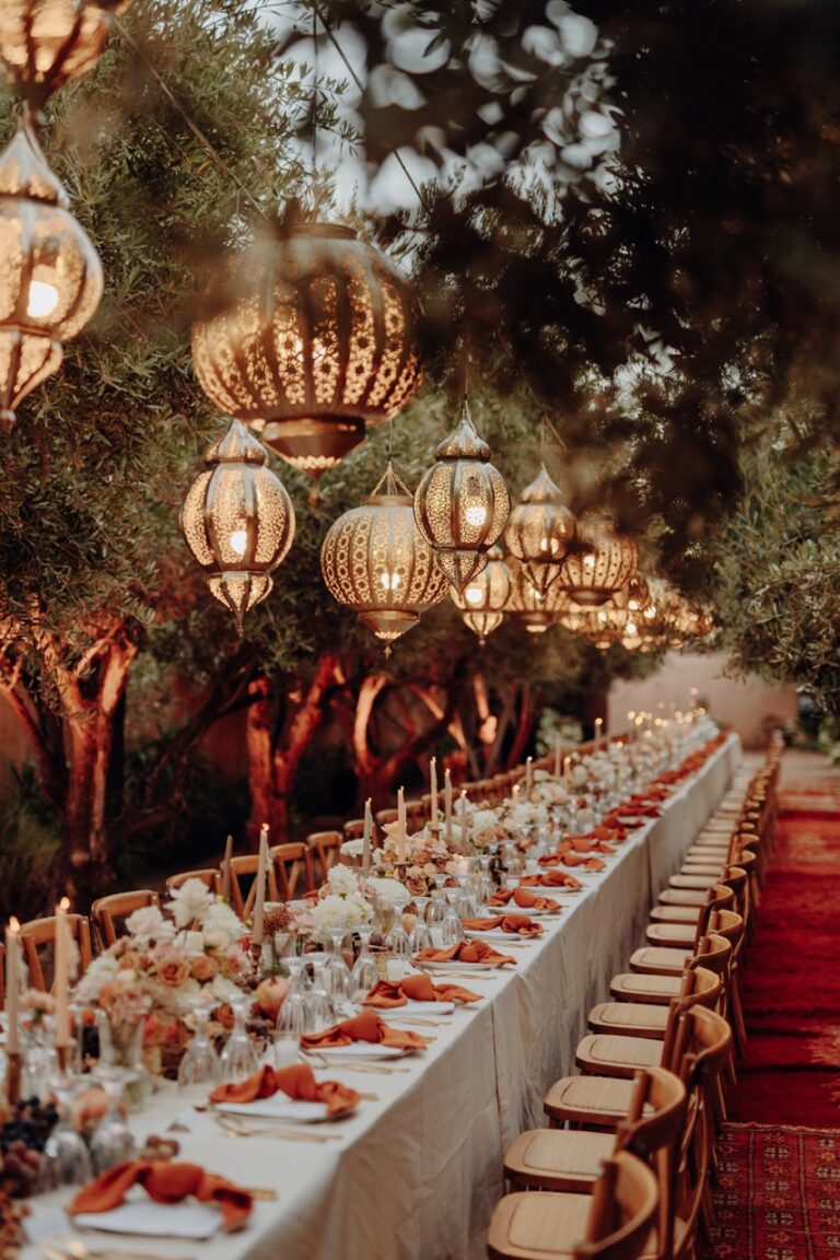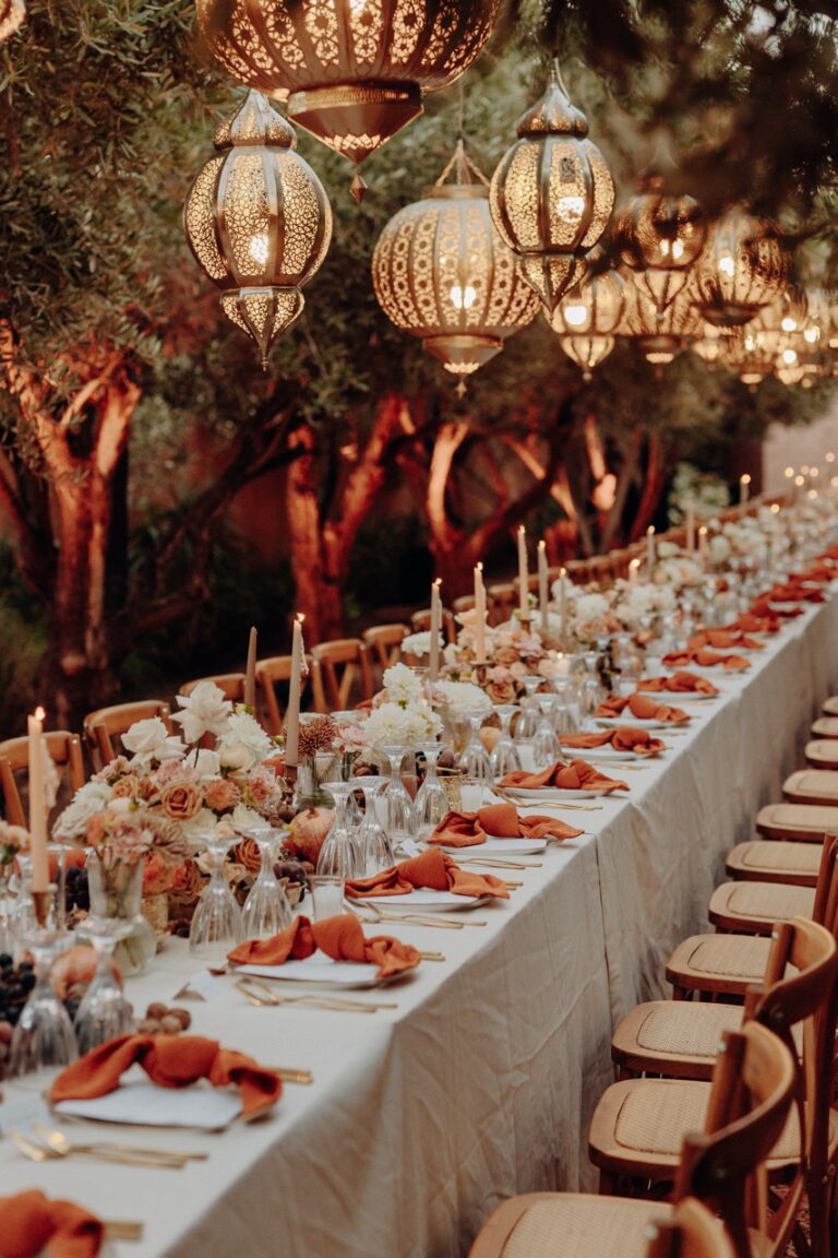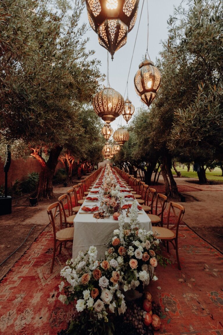 Guests were treated to a luxurious reception that blended Moroccan flavors with a contemporary twist. Long banquet tables were adorned with gold accents, lush floral arrangements, and flickering candlelight. The menu featured a mix of traditional dishes like lamb tagine and modern delights, ensuring an unforgettable culinary experience.